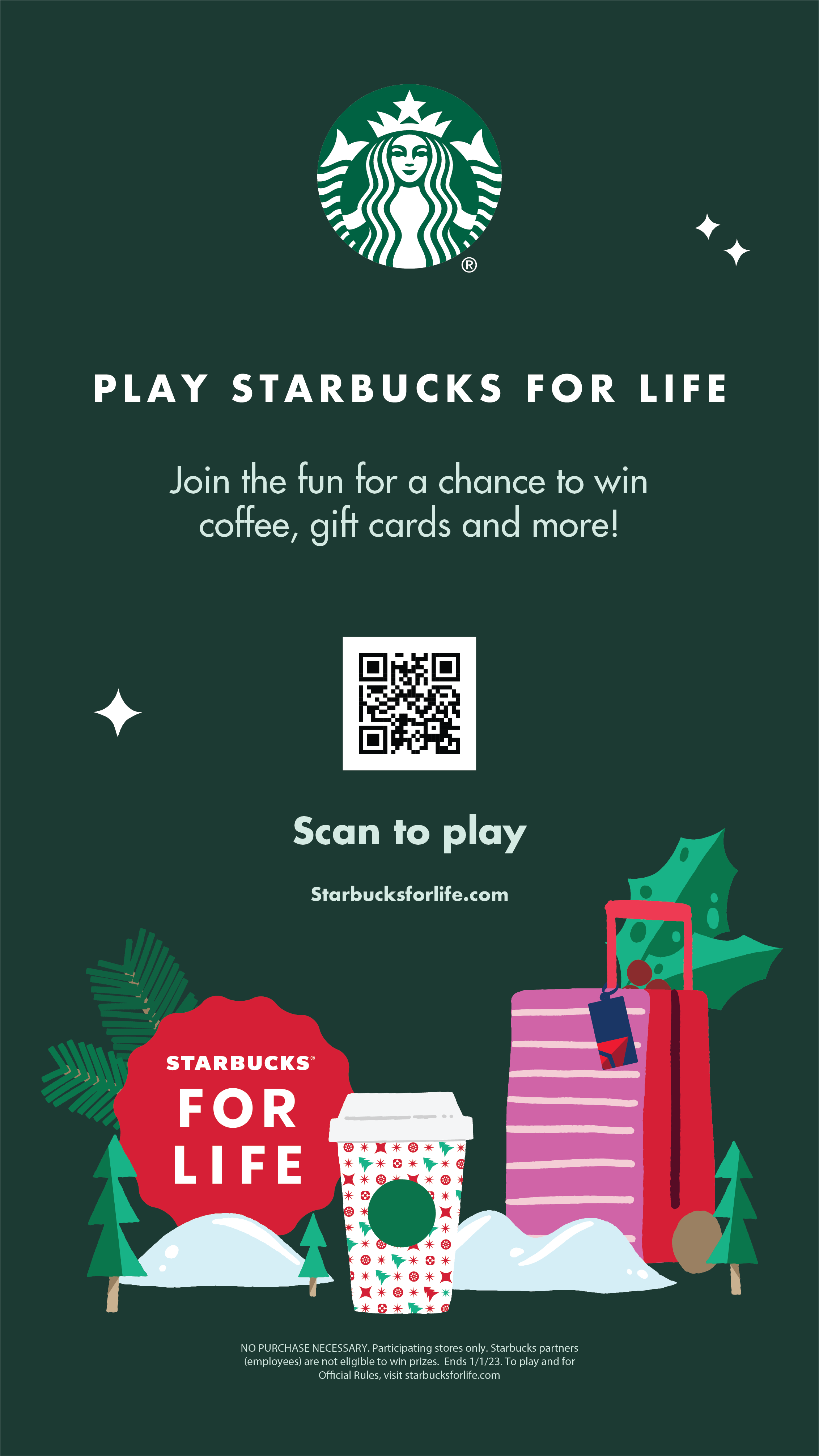 Starbucks for Life is a gamified sweepstakes to encourage app engagement and purchases during the holiday season. Starbucks Rewards members play for instant prizes like free drinks/food, bonus stars, gift cards, exclusive merchandise, and the chance to win the grand prize of a daily free food/drink credit for 30 years.